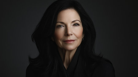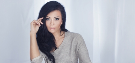 Young attractive woman with long black hair on dark background.