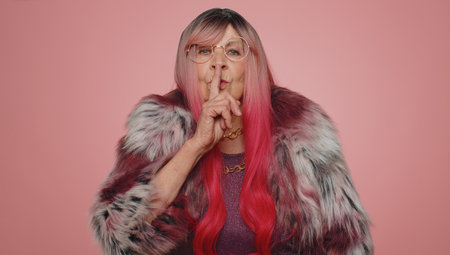 Shh be quiet please. Stylish mature woman 70 years old presses index finger to lips makes silence gesture sign do not tells secret. Senior elderly grandmother posing on pink studio wall background