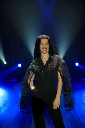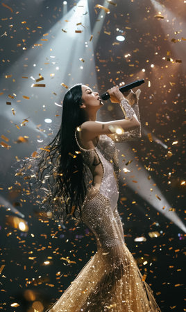 beautiful woman singing in microphone at stage of musical festival, female artist sing song on scene. High quality photo