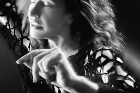 Recreation dance. Vitality energy. Inspired woman with closed eyes enjoying spiritual practice on dark with motion blur.