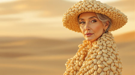 Elegant woman in a creative almond hat and coat in desert setting.