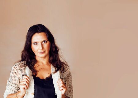pretty brunette confident mature woman posing cheerful on warm background, lifestyle people concept closeup