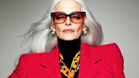 Fashion portrait of stylish senior woman in red coat and sunglasses.