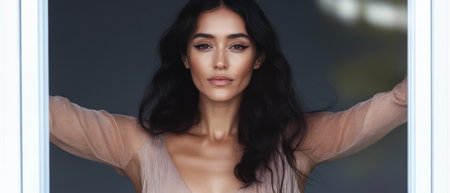 A woman with long dark hair stands gracefully at a window gazing thoughtfully outside. The soft natural light highlights her features and contemporary attire creating a serene atmosphere.