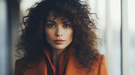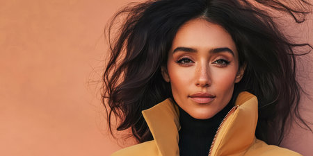 A model showcases a stylish yellow jacket highlighting her captivating features and flowing hair. The warm textured backdrop complements her confident expression in this editorial setting.