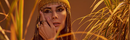 Woman in egyptian headdress touching cheek while standing near plants isolated on brown, banner