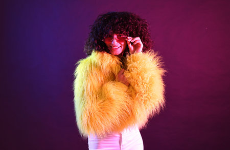 Beautiful young woman in yellow fur coat and sunglasses on color background in neon lights