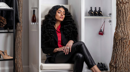 Fashionable woman posing in stylish boutique interior with unique tree design.
