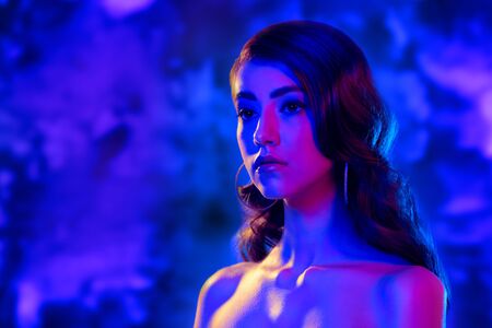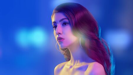 Art beauty. Portrait of a girl with big beautiful brown eyes and dark wavy hair in blue and crimson light. Make-up and cosmetics. Copy space.