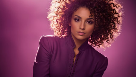 Elegant Woman with Curly Hair on Purple