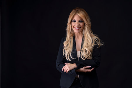Beautiful European model, business woman, blonde middle-aged, posing in the studio on a black background. High quality photo