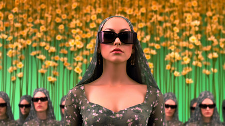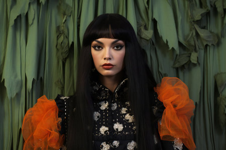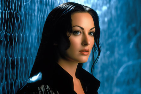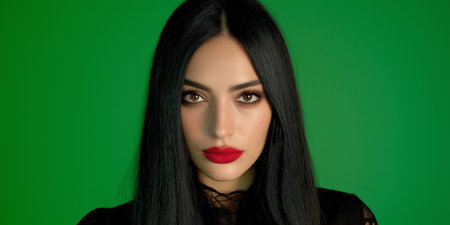 A beautiful woman with long black hair and red lipstick poses for the camera against a green screen. Generative AI