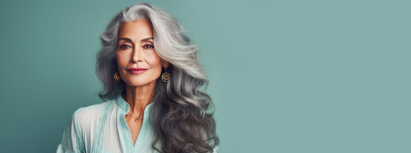 Elegant, elderly, chic latino, Spain woman with gray long hair and perfect skin, green background, banner. Advertising of cosmetic products, spa treatments, shampoos and hair care products, dentistry and medicine, perfumes and cosmetology for women