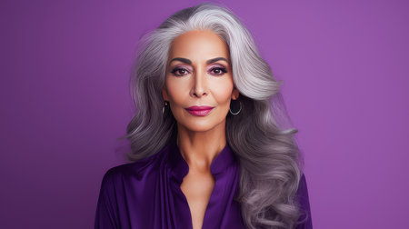 Elegant, elderly, chic latino, Spain woman with gray long hair and perfect skin, purple background, banner. Advertising of cosmetic products, spa treatments, shampoos and hair care products, dentistry and medicine, perfumes and cosmetology for women