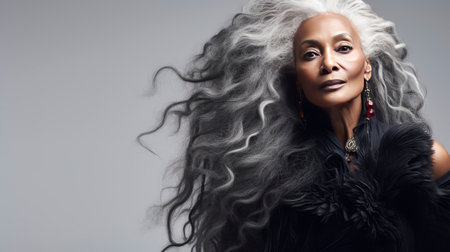 Elegant, elderly pensioner, chic African American woman with gray long hair, white background, banner. Advertising of cosmetic products, spa treatments, shampoos and hair care products, dentistry and medicine, perfumes and cosmetology for women