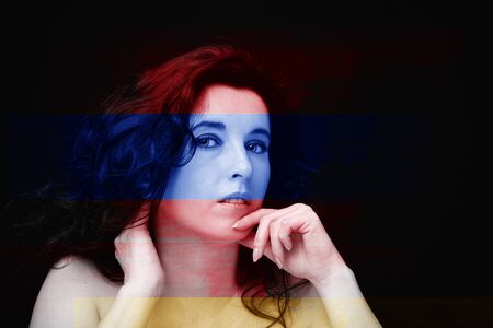 A girl on a black background with double exposure with red hair in the wind