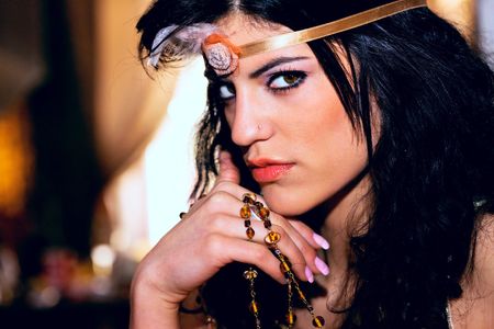 black hair woman portrait with head decoration, closeup, indoor shot