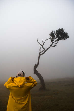 Fanal, Madeira, Portugal, person in a yellow raincoat in the foreground, landscape in the background