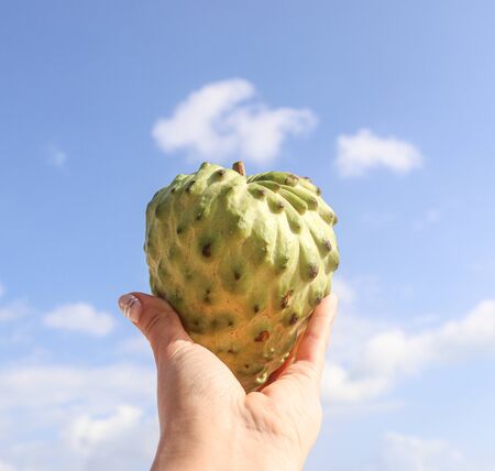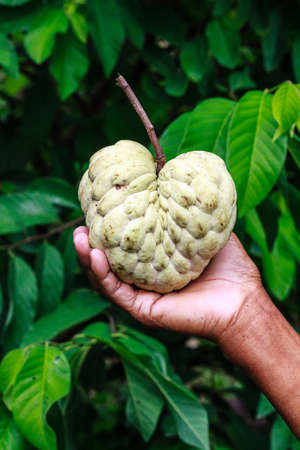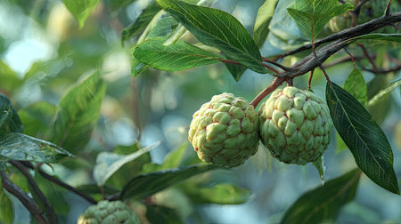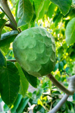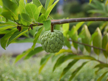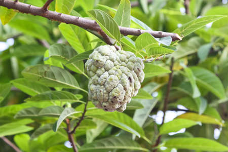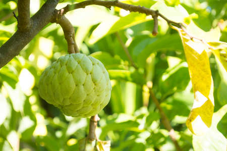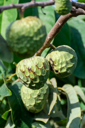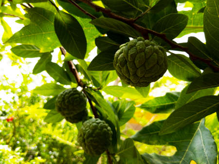 Custard apple fruit​ on​ the​ tree.A sweet fruit​ of Thailand.Delicious and freshness test.View​ of​ copy​ space.
