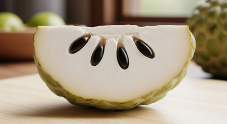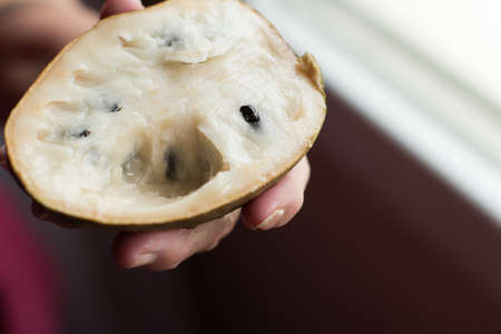 A custard apple cut in half and held by a woman's hand near the window. Cherimoya seeds and pulp. Health&Wellness.