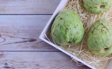 Top view. Custard apple, fruit, inside a white box, on a rustic wooden background.