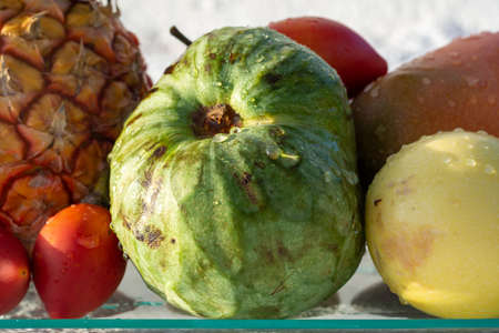 Custard apple or green ripe cherymoia, passion fruit, pineapple, tamarillo exotic fruits close up