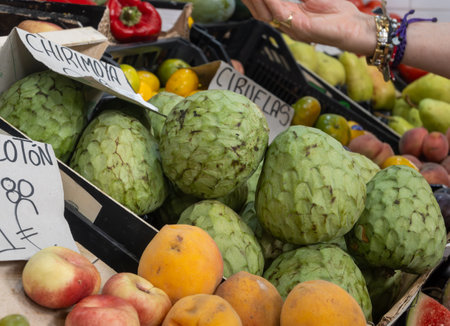 Fresh juicy colorful fruits, peaches, andalusian cirimoya, plums and andalusian mango tropical fruits on farmer market in Andalusia, Seville, Spain