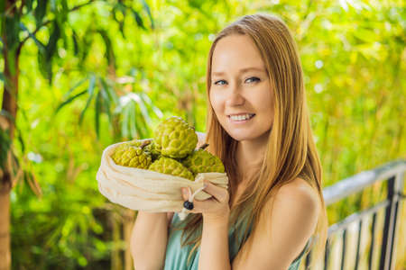 Cherimoya in a reusable bag in female hands. Zero waste concept, plastic free concept. Healthy clean eating diet and detox. Summer fruits
