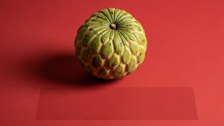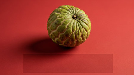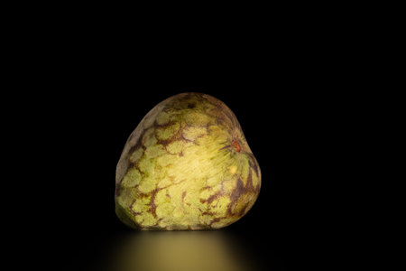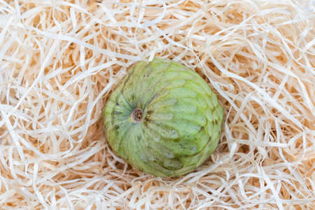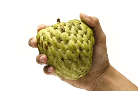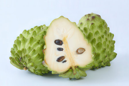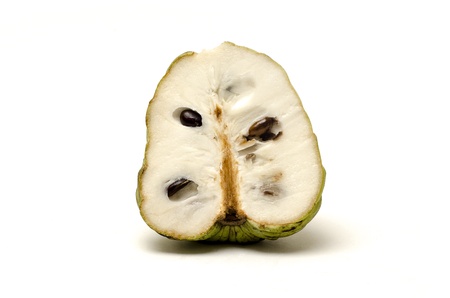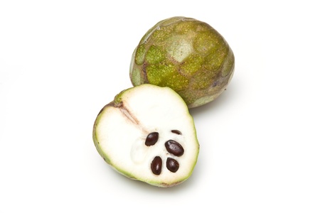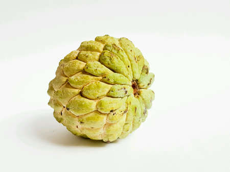 Custard apple. A Cherimoya family fruit with green and leathery skin. It has white creamy and sweet flesh inside. Shot on white background
