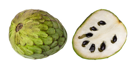 Fresh exotic tropical fruit. Two halfs of custard apple isolated on white background, annona cherimoya.