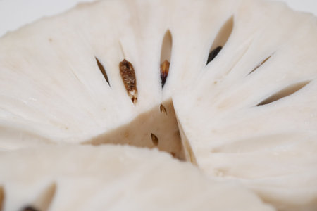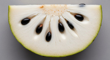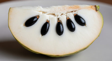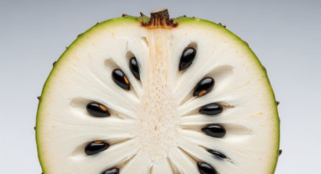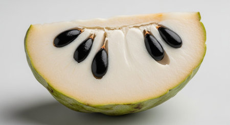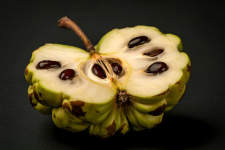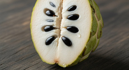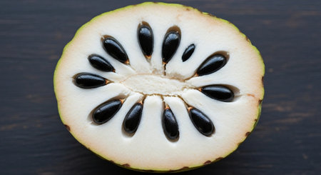 A detailed view of a sliced cherimoya fruit against a dark background. The creamy white interior with numerous dark, glossy seeds is prominently displayed.