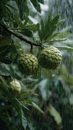 Cherimoya in the rain, heavy rain pouring down, natural.