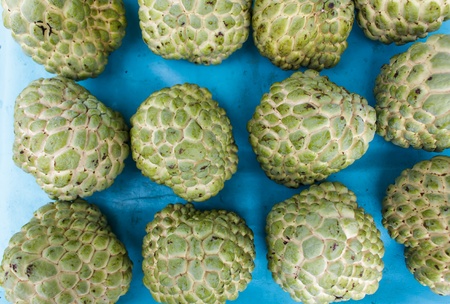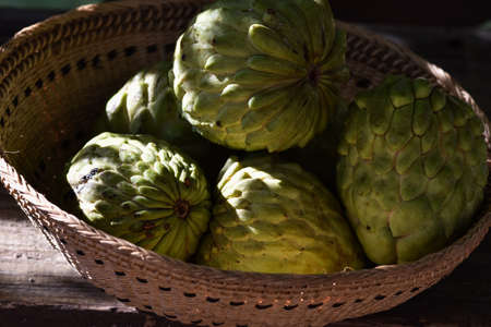 Sugar apple on wooden box in the fruit market Asian / Annona sweetsop or or custard apple