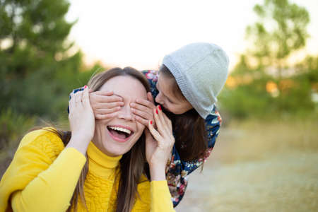 Happy young girl laughing, covering eyes of her mother with her hand. Adorable little girl surprising her mother