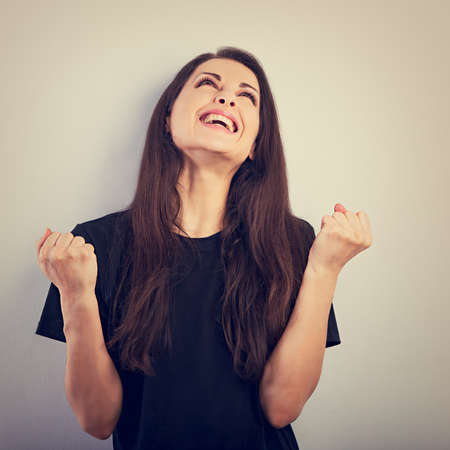 Happy excited beautiful woman showing success triumph sign by fist on blue background and happy looking up in black t-shirt. Portrait toned vintage color