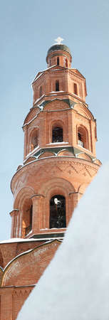 Brick high bell tower with snow covered cross at snowfall