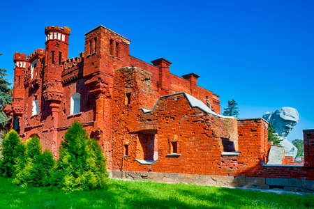 Monument to Vasily Bazhenov and Matvey Kazakov on the background of the Bread House. State Historical and Architectural Museum-Reserve Tsaritsyno. Moscow, Russia