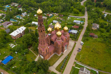 Top view of the Church of the Resurrection of Christ in the city of Vichuga, Ivanovo region, Russia. Photo taken from a drone.