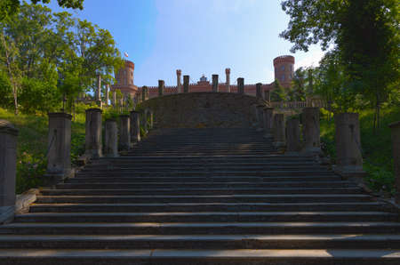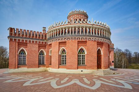 Moscow, Russia - August 12, 2018: View of Small palace in Museum-reserve Tsaritsyno against blue sky and green trees in sunny summer morning