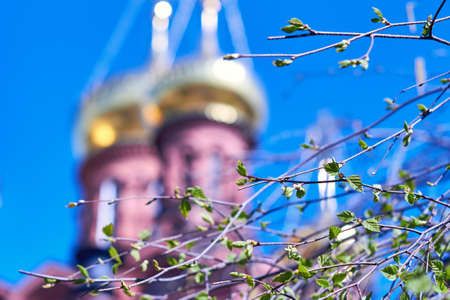 Golden domes of the Church against the leaves of the tree. Blue sky and ancient Christian Church in Sergiev Posad, Russia.
