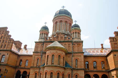 beautiful historical building of Chernivtsi national university religious seminary of red brick facade with blue sky sunny outdoor in Ukraine