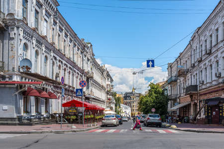 Kyiv, Ukraine - July 13, 2019: Exterior of old residential buildings on the Ihorivska Street in the historic district called Podil (Podol), Kyiv downtown.