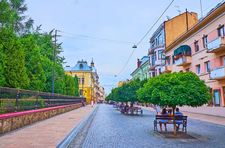 CHERNIVTSI, UKRAINE - JULY 16, 2021: The small green maples and benches in its shade, located on Olha Kobylyanska Street in old town, on July 16 in Chernivtsi