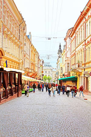 The pedestrian street named Olga Kobylianska. Architecture in the old town Chernivtsi. Western Ukraine
