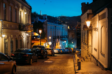 Night View Of City Streets Of Tbilisi. Parked Cars In A Row On A Street Of Tbilisi