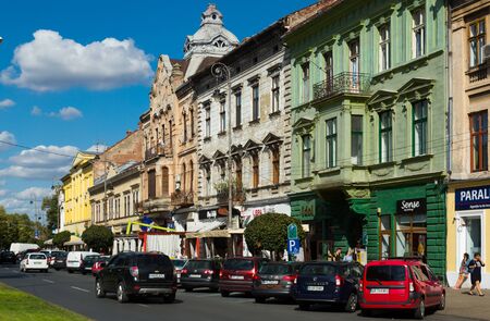 ARAD, ROMANIA - SEPTEMBER 13, 2017: Peculiar architecture of colored houses on streets of Arad town