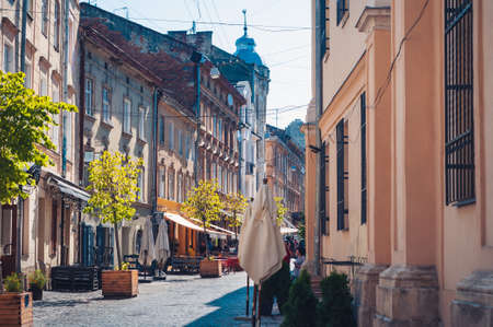 Lviv, Ukraine 07.07.2021. Street in the old town of Lviv, Ukraine, on a sunny summer morning