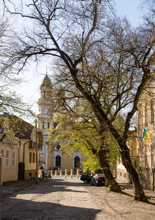 UZHHOROD, UKRAINE - APRIL 12, 2020: Greek Catholic Cathedral in Uzhgorod, Ukraine. Krestovozdvizhensky Cathedral is a landmark of the city of Uzhhorod. Built in 1646
