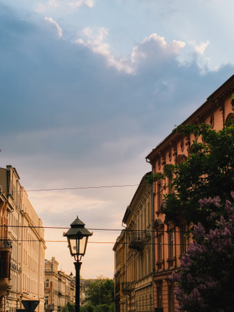 Street lamp stands tall amidst charming European buildings, casting warm glow as sun sets, painting sky with vibrant hues and fluffy clouds. Street lamp illuminating historic architecture, golden hour