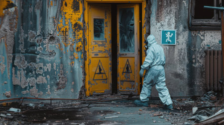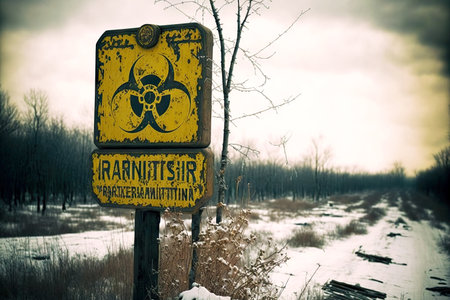 Close-up of radioactive warning signs at Chernobyl, weathered warnings, haunting atmosphere, detailed linework, atmospheric scene Generative AI